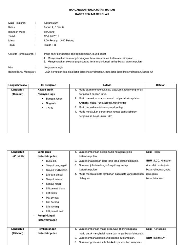Saya ada simpan beberapa contoh RPH tu time sy bertugas sebagai instruktor Kelana Siswa kt tempat saya belajar nisomende2 ni berguna kepada saya dan rakan2 yang lain semasa melaksanakan praktikal sebagai seorang guru di sekolah nantiwaduhhhh. Bagi perjumpaan 3 hingga ke-12 pelbagai aktiviti boleh dirangka guru bermula dengan gajet simpulan dan ikatan bantuan awal kecemasan kawad kaki dan pelbagai lagi. February 8 2022 0.