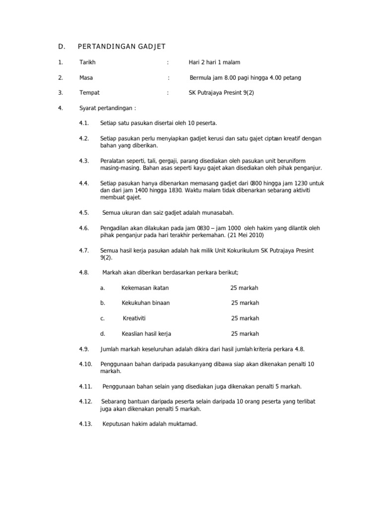 _____ kumpulan kekemasan kesesuaian kemahiran kerjasama jumlah tema dan dan markah 25 m 25m kreativiti interaktif 25m 25m 100m 1 2 3 4 5 6 7 8 9 10 11 12 13 14 15 16 17 18 19 20 borang pemarkahan pertandingan rekacipta daripada bahan terbuang tema. Peserta pitching 40 m tempo 30 m ton mutu suara 15 m gaya persembahan 10 m pakaian 5m jumlah 100. View 2 MODUL PERTANDINGAN GAJETdocx from BIOTECT 3 at Kolej Vokasional Sungai Petani 2.